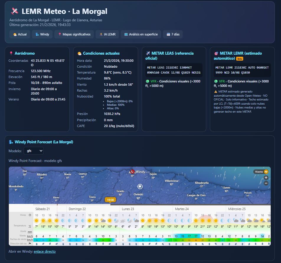 - Aviation Weather (NOAA): METAR del aeropuerto más cercano (LEAS).
